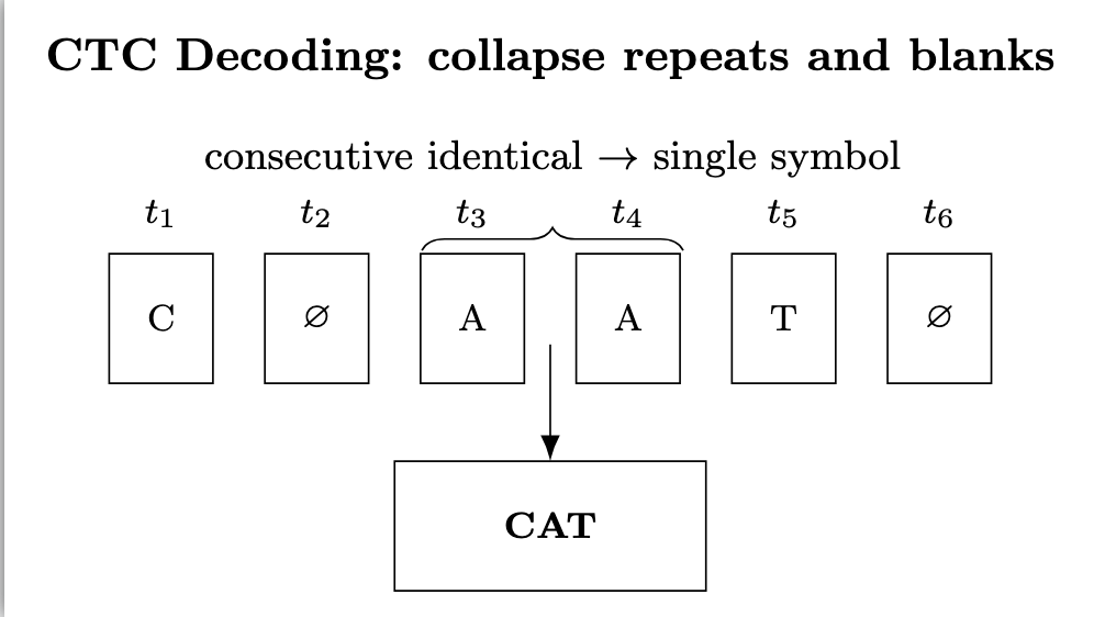 After collapsing blanks and duplicates, CTC produces: “cat”.
